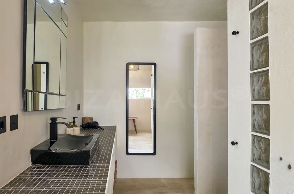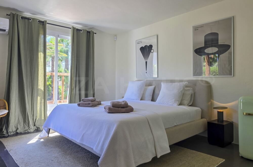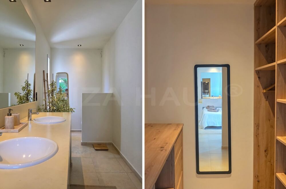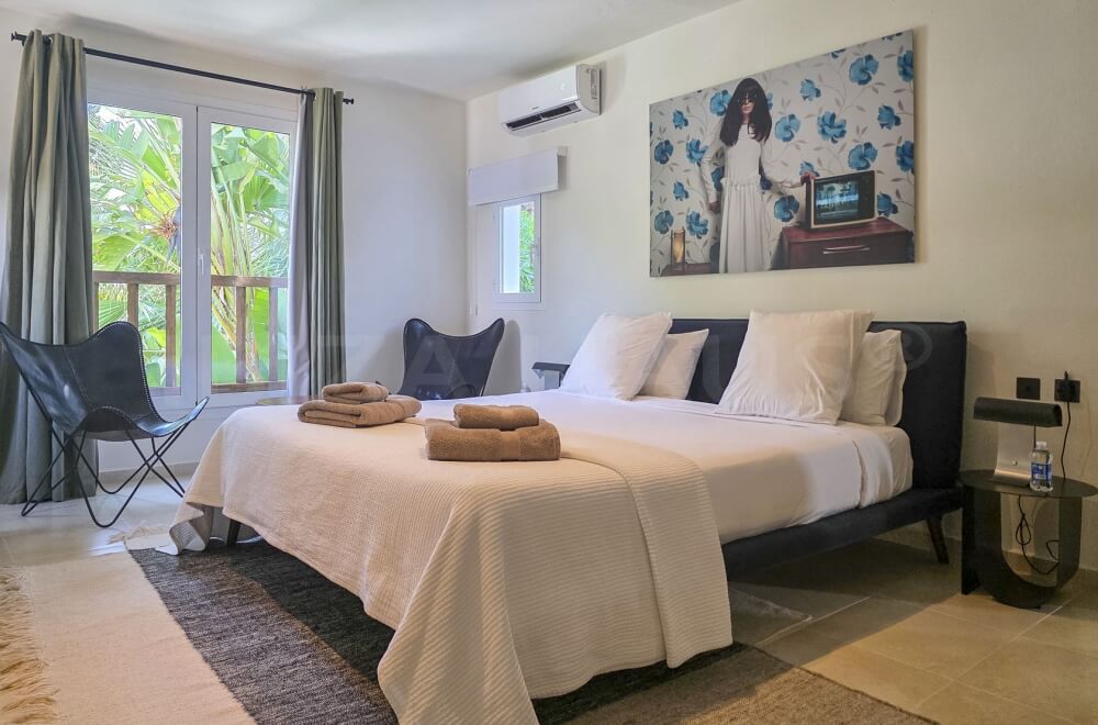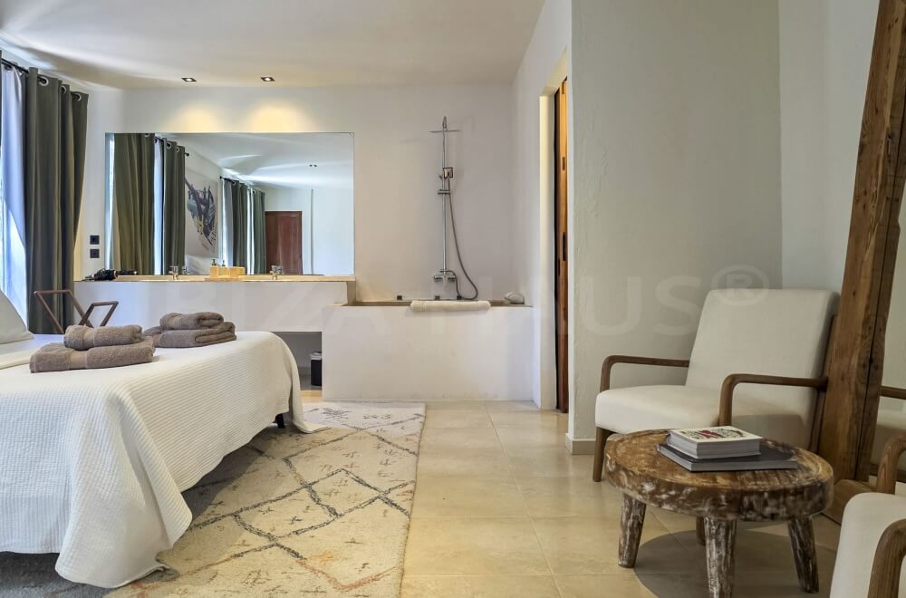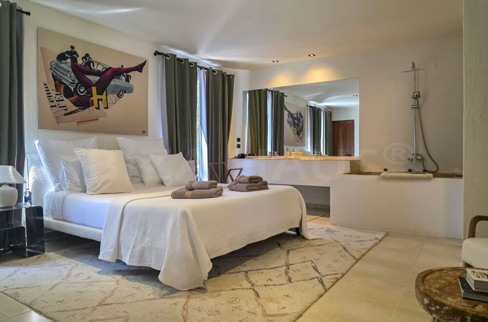 In the main building, there are 2 large bedrooms with adjacent bathrooms (one with a Jacuzzi) and walk-in closets. A separate staircase outside leads to 2 other bedrooms with en-suite bathrooms, one of which has its own terrace overlooking the pool. In the garden, there is an apartment with a fifth bedroom, its own bathroom, and a small private garden with a lounge chair.