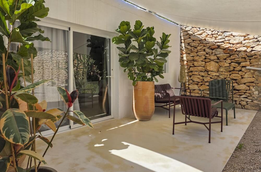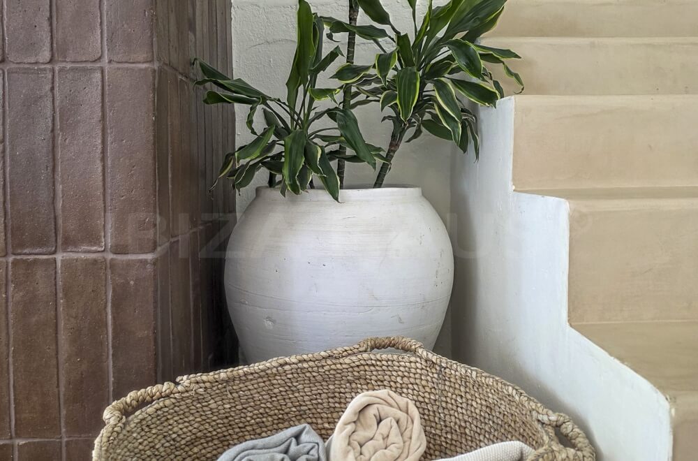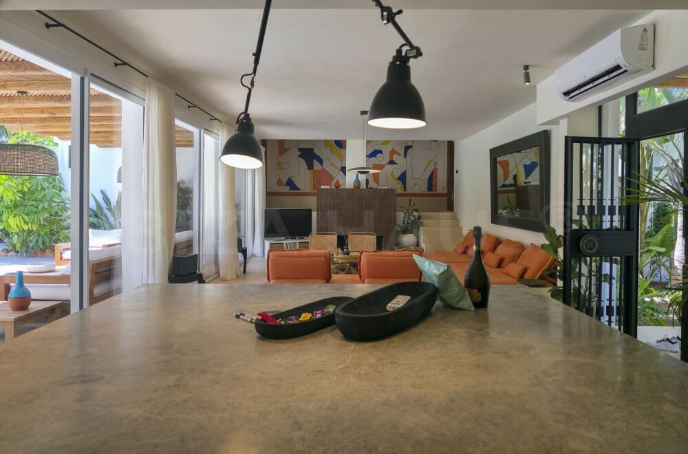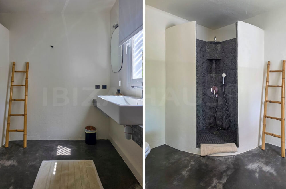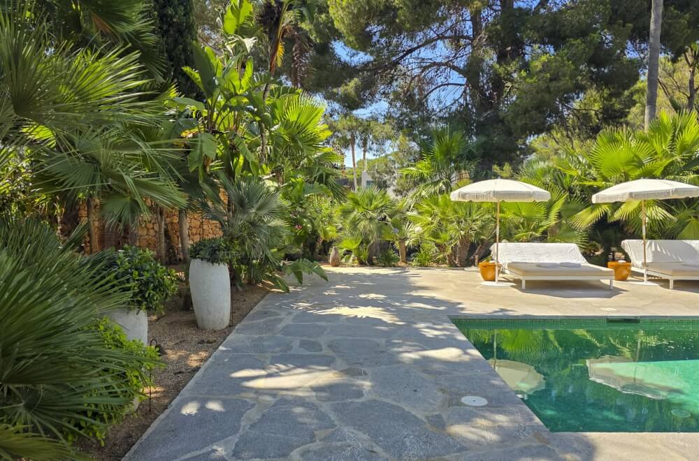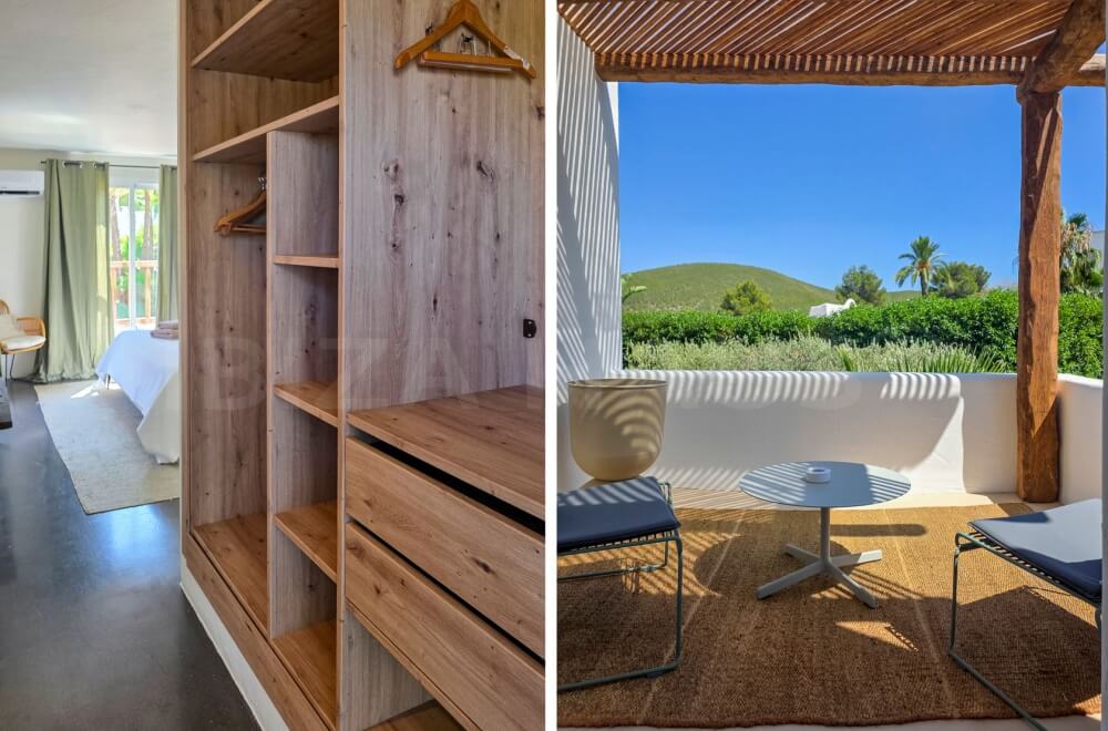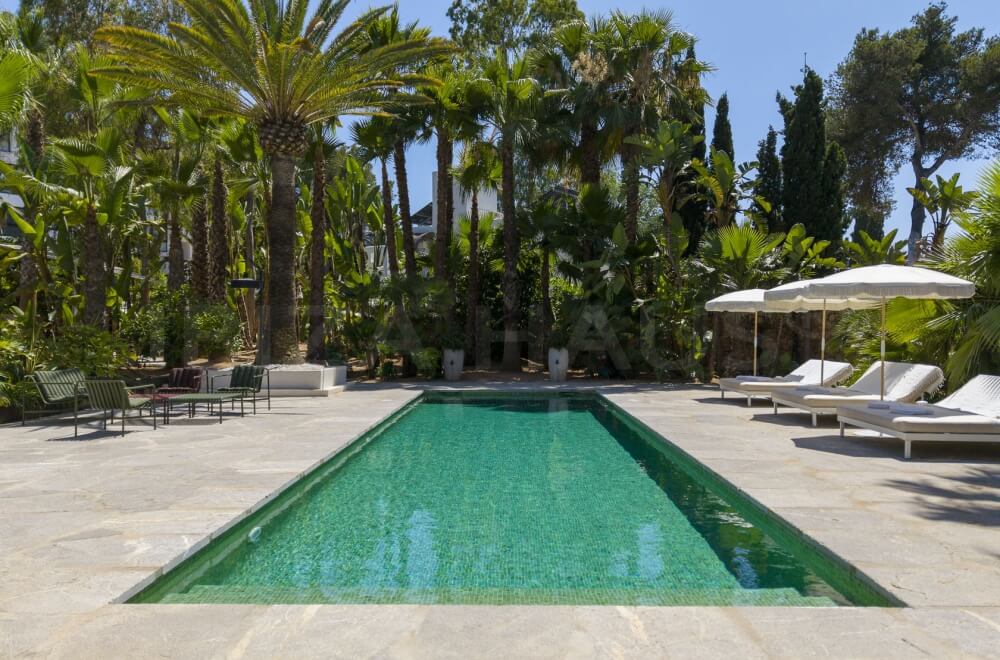 In the main building, there are 2 large bedrooms with adjacent bathrooms (one with a Jacuzzi) and walk-in closets. A separate staircase outside leads to 2 other bedrooms with en-suite bathrooms, one of which has its own terrace overlooking the pool. In the garden, there is an apartment with a fifth bedroom, its own bathroom, and a small private garden with a lounge chair.