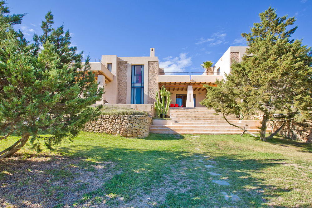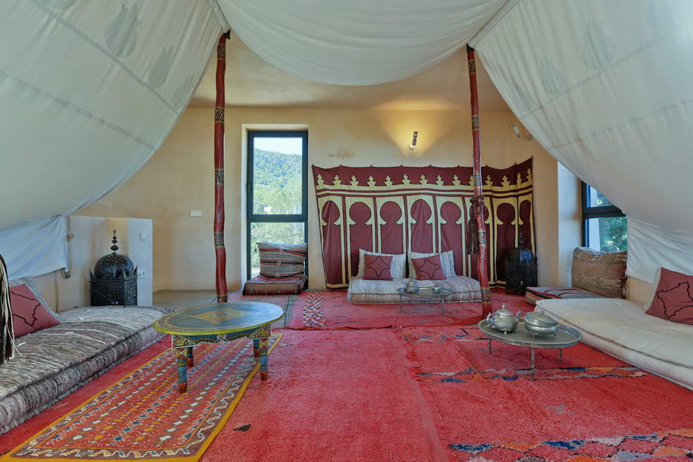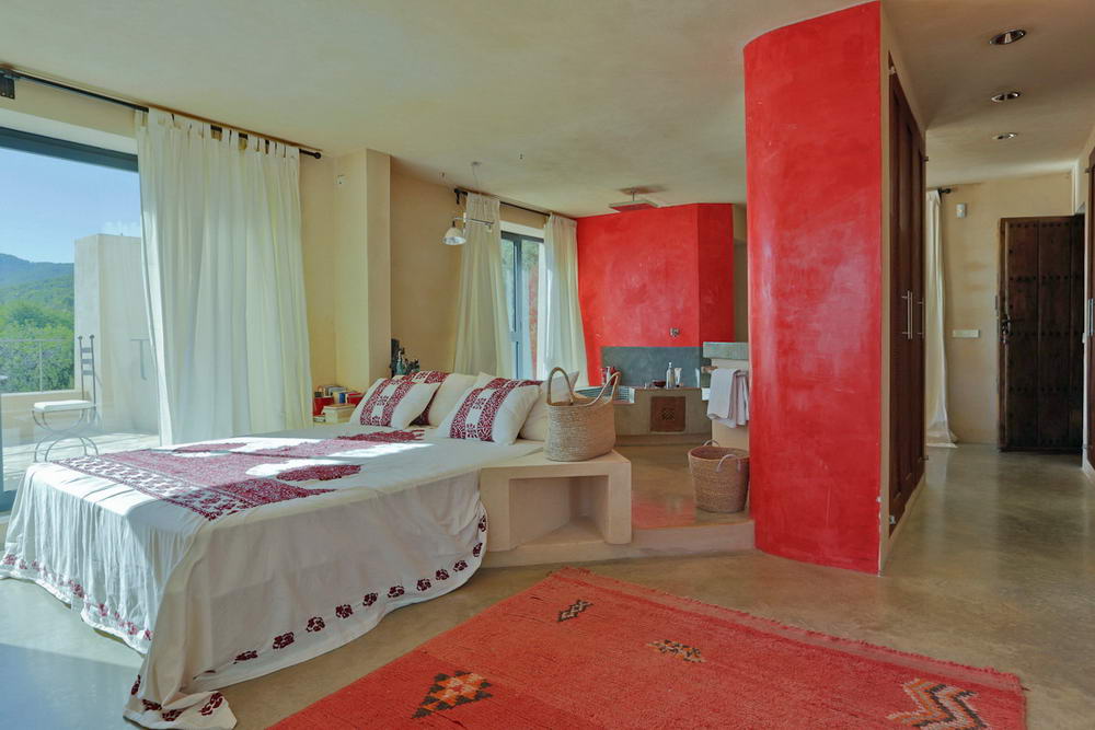 Die 450 m² große Villa mit Meerblick steht in Es Cubells, im Süden der Insel, von wo aus man bis nach Formentera sehen kann. Zum Haus gehören 10.000 m² Grund mit Zitrusbäumen, Pinien und Kakteen sowie ein 18 m langer Pool. Die Strände Cala Jondal und Es Torrent sind gleich um die Ecke, das Dorf ist zu Fuß erreichbar und nach Ibiza-Stadt sind es 20 Minuten. Im linken Turm befinden sich die drei Schlafzimmer, jedes mit eigener Terrasse. Im rechten Turm befindet sich der 7 m hohe Wohnraum mit Kamin und Galerie, und im ersten Stock unter einem Original-Berberzelt gibt es einen marokkanischen Teesalon.