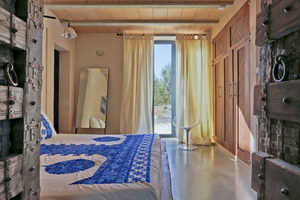 Die Boho-Chic-Trend-Einrichtung der Villa Es Cubells ist modern, aber nicht kühl und lebt von Gegensätzen. Das Interieur ist das Ergebnis vieler Reisen nach Marokko und Asien. So stammen die Türen im ganzen Haus entweder vom Festland oder aus Bali und Thailand. Der Esstisch (ein durchgeschnittener Baumstamm) stammt aus Burma, Bettdecken und Kissen wurden in Marrakesch gefertigt. Als Kontrast dazu dienen Stühle von Philippe Starck, ein modernes Lichtkonzept von Maurer und ein Boden aus grauem Cemento Liso.