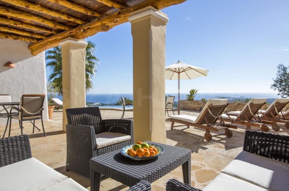 Im traumhaften Osten der Insel, mit atemberaubendem Panorama-Meerblick auf das offene Mittelmeer und die Nachbarinsel Formentera, liegt das moderne Ferienhaus im authentischer Finca-Stil Casa Formentera (ehemals Can Morna 2) mit separatem Gäste-Apartment.