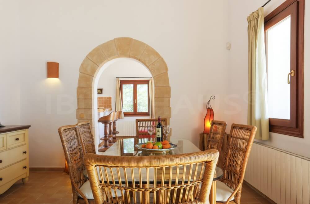 Durch den Haupteingang gelangen Sie in die typische ibizenkische Eingangshalle mit hoher Sabina-Holzdecke und direktem Zugang zur Frühstücksterrasse und der Poolterrasse. In der Eingangshalle befindet sich auch der Essbereich.