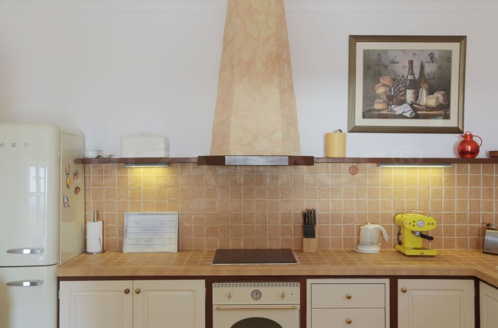Ein offener Bogen führt Sie in den Wohnbereich mit SAT-TV und Terrassenzugang. Daran anschließend befindet sich die geräumige, liebevoll ausgestattete Küche mit einer wunderschönen Naturholz-Theke zum Klönen. Das Fenster zeigt zum Sonnenaufgang (für Frühaufsteher!).